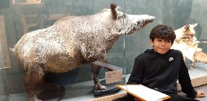 Adam à l’observatoire des Alpes , à Sallanches, avec un sanglier empaillé.